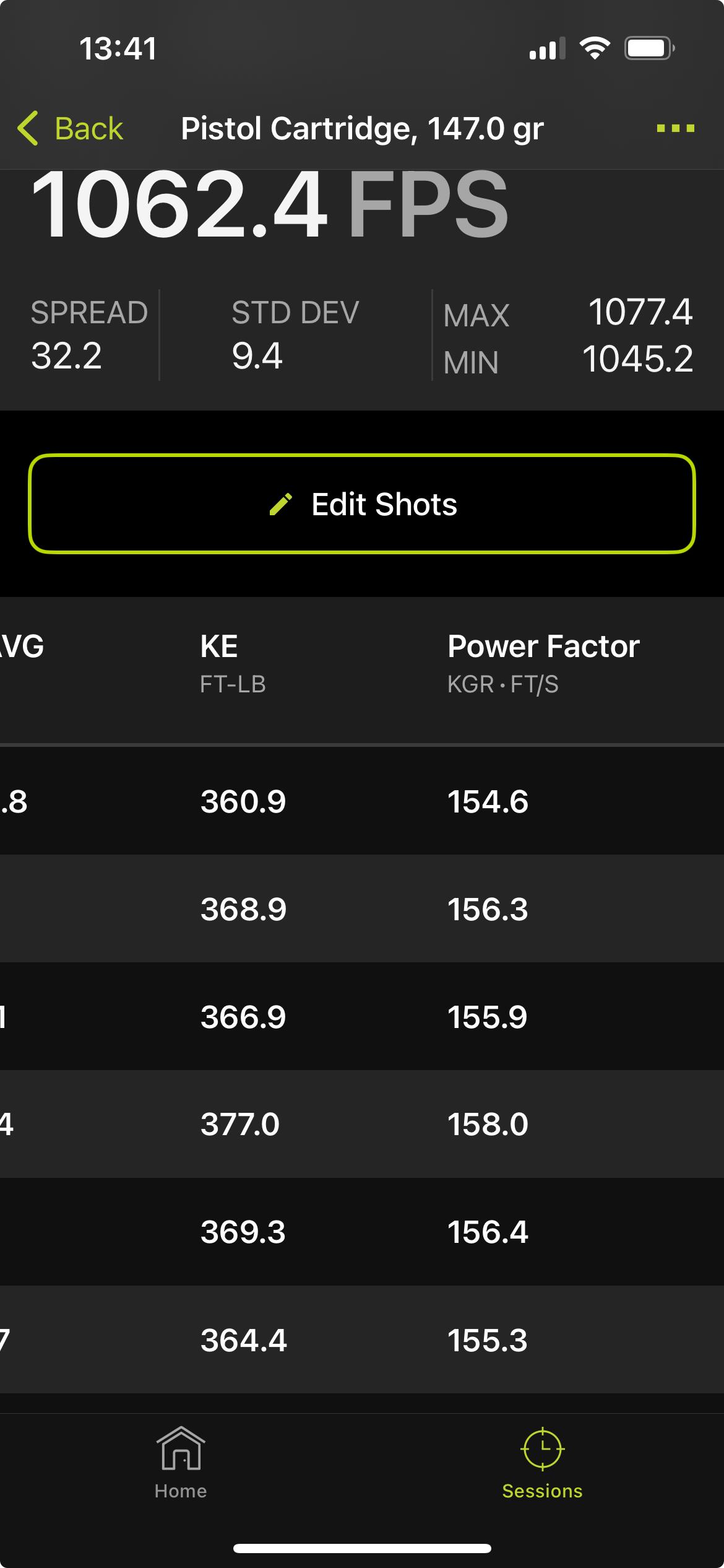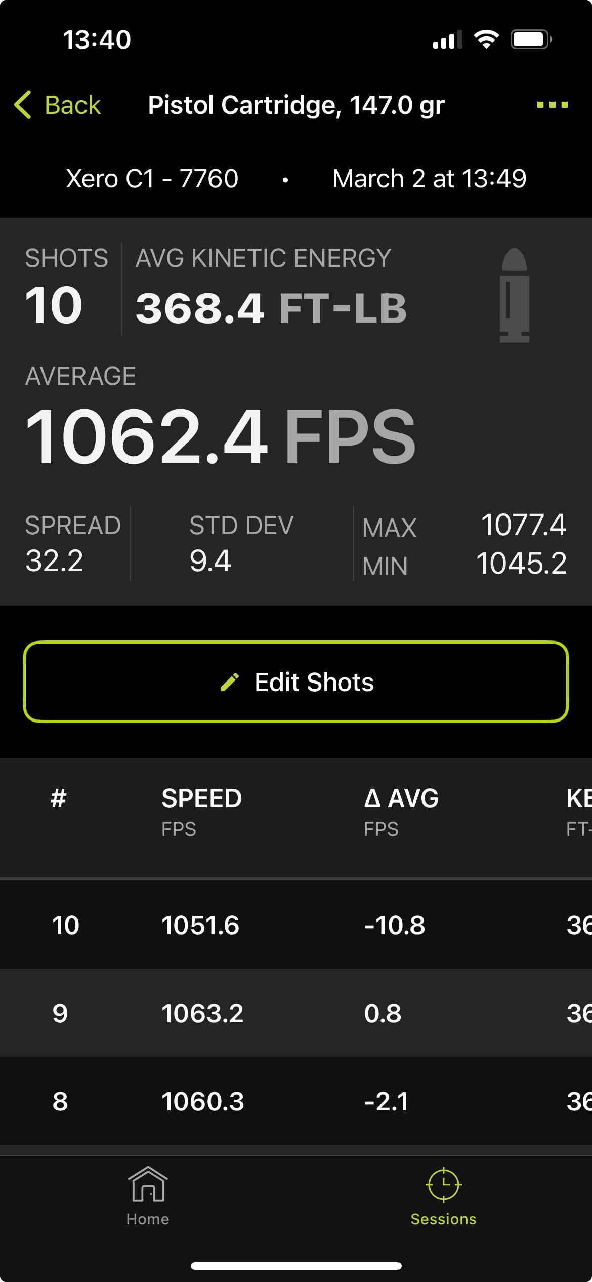 Now for some output, which I think is really cool. My other chronographs are “dumb” in that they only track a string of shots on the device itself and then I have to delete it before the next string so that it doesn’t mix up data like averages, extreme spreads, standard deviations, etc. The Garmin separates every string into its own “Session” and keeps it distinct from the others.
