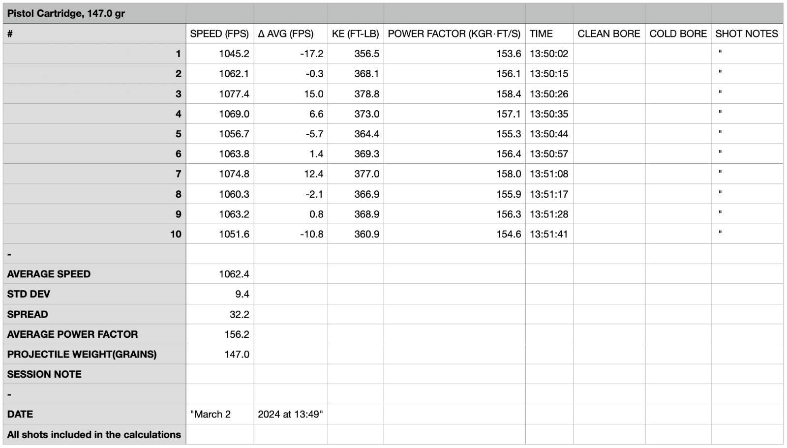 What I found really nice was the export feature. Once you’ve logged a session, you can view and edit it in the app at any time later on. If you want, you can export it as a .csv file for opening in any spreadsheet editor. Here, you see all of the same data for any particular string, but also even more detail like the specific time for each shot, deviations, notes, and any flags you’ve added to it.