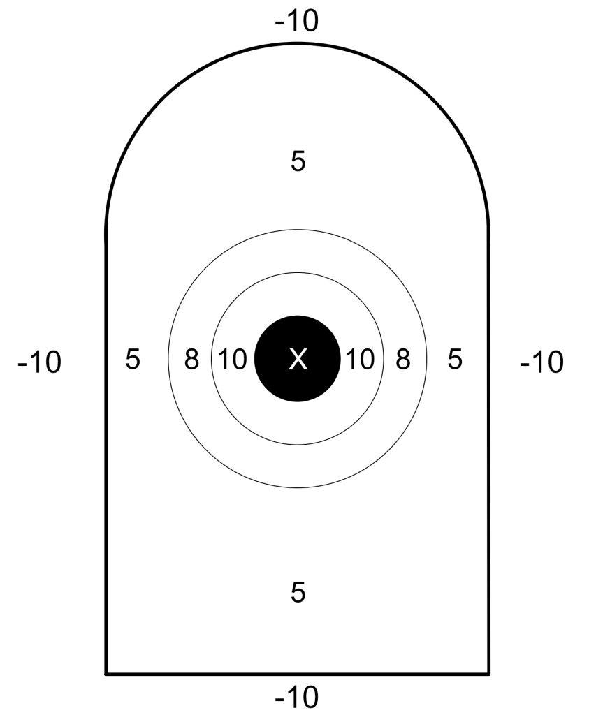 Since we’re focused on the practical implications of marksmanship, and we’re accountable for every bullet, any hit outside of the tombstone is a -10 point deduction.