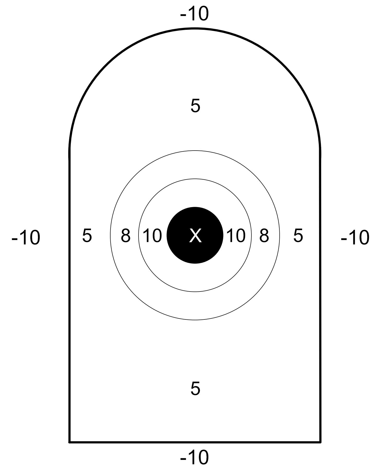 The AP-2 has four scoring zones. The middle black is the 1.1″ X-ring and is worth 10 points. The next ring out is the 2.2″ A-ring, and is also 10 points. Then a 3.3″ B-Ring worth 8 points. The remainder of the area inside the tombstone is 5 points.