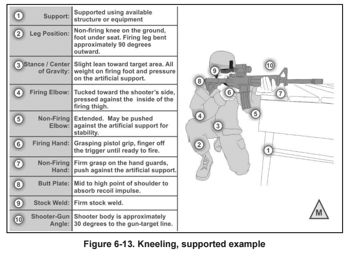 In this position, you set the rifle on an object and use the firing side knee to brace the firing side shoulder. By doing this, you create more points of contact to support the rifle and control recoil.