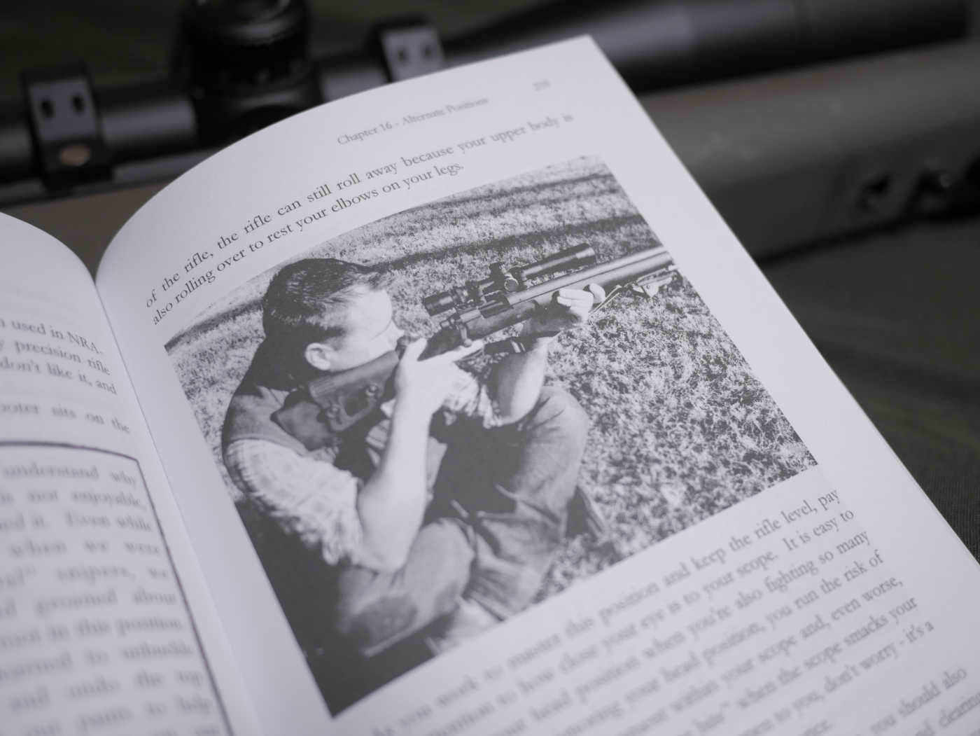 The chapters on shooting and spotting are useful, discussing the basics of building a solid position with the rifle and stabilizing it. The shooting chapter does not actually discuss field positions beyond prone (that’s later), but does emphasize the importance of a stable position using bags, loading, and other mechanisms.
