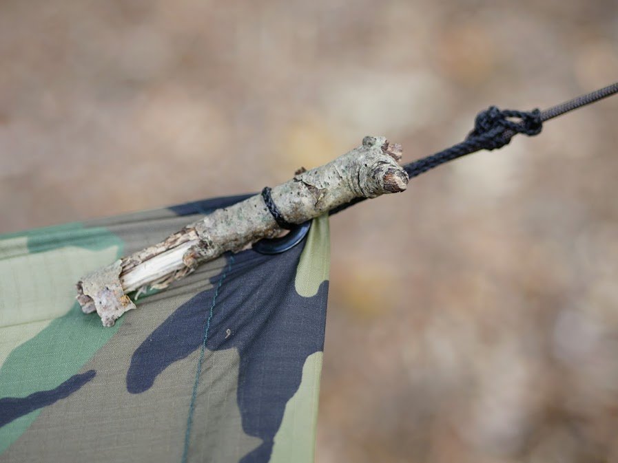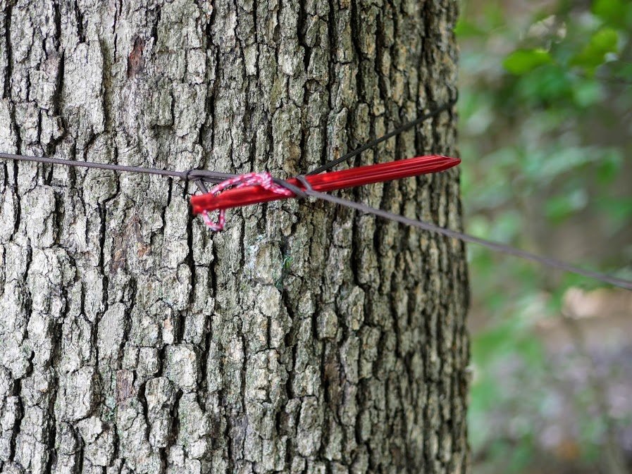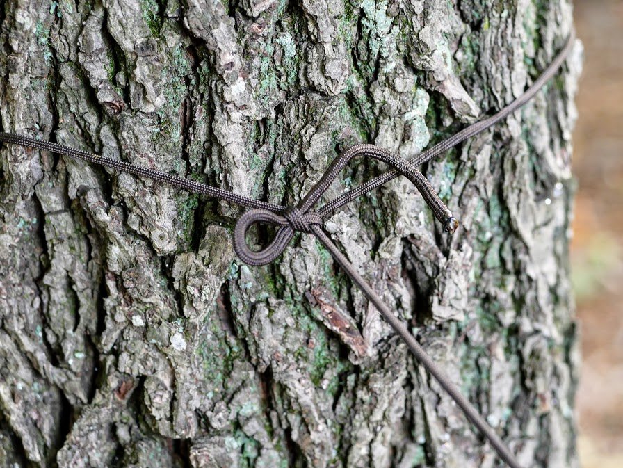 This is my favorite way to anchor one end of a ridgeline without any additional equipment. The other option is a Marlinspike Hitch using a bowline knot and a stake or stick.