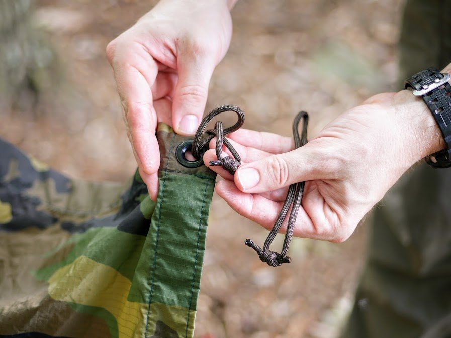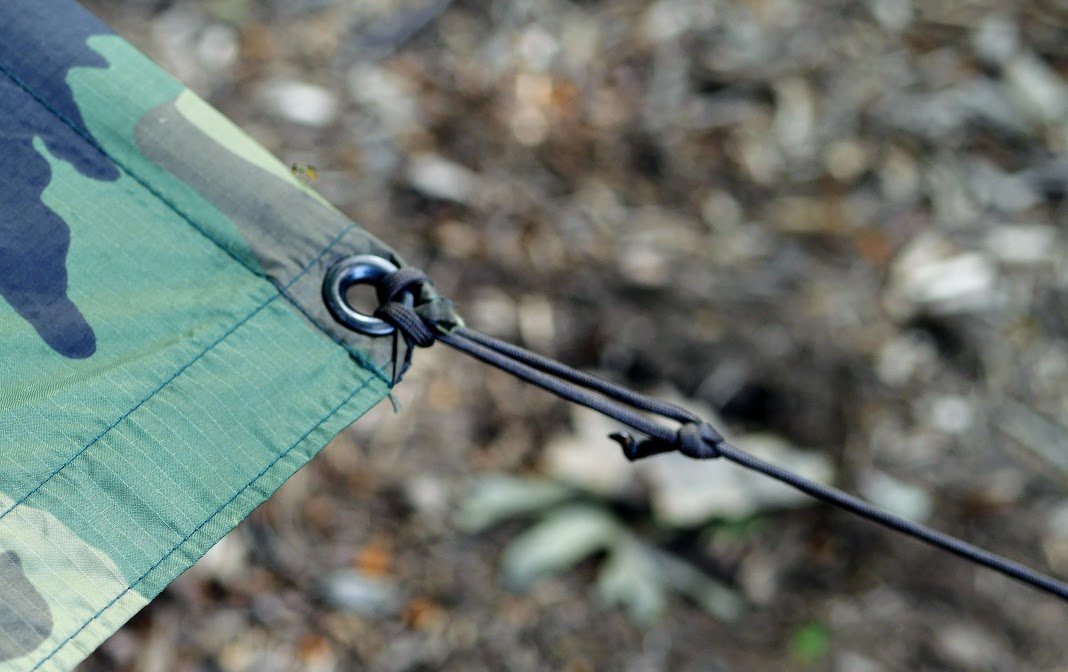The loop, by the way, is tied with a fisherman’s knot. I’ll get to that one in a minute. The Prusik lets me tension a tarp or poncho on the ridgeline by simply sliding it to the desired position. When you slide it enough, the knot holds nice and tight.